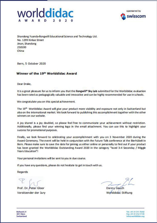 2020年,朗威®空中实验室Sky Lab——无人机挂载数据采集器和水样土样抓取系统荣获世界教具联合会创新产品大奖。